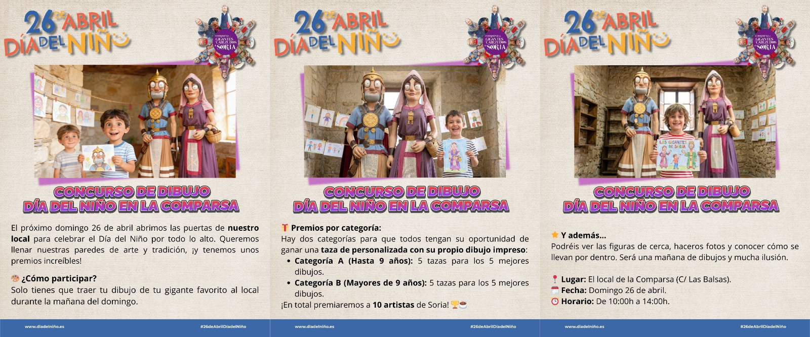 La agrupación Gigantes y Cabezudos de Soria ha presentado su programa de actividades para conmemorar una fecha muy especial, sobre todo entre la chiquillería. Bajo el lema 'Concurso de dibujo: El Día del Niño en la Comparsa', la asociación cultural busca llenar las paredes de su sede con el arte de los más pequeños.