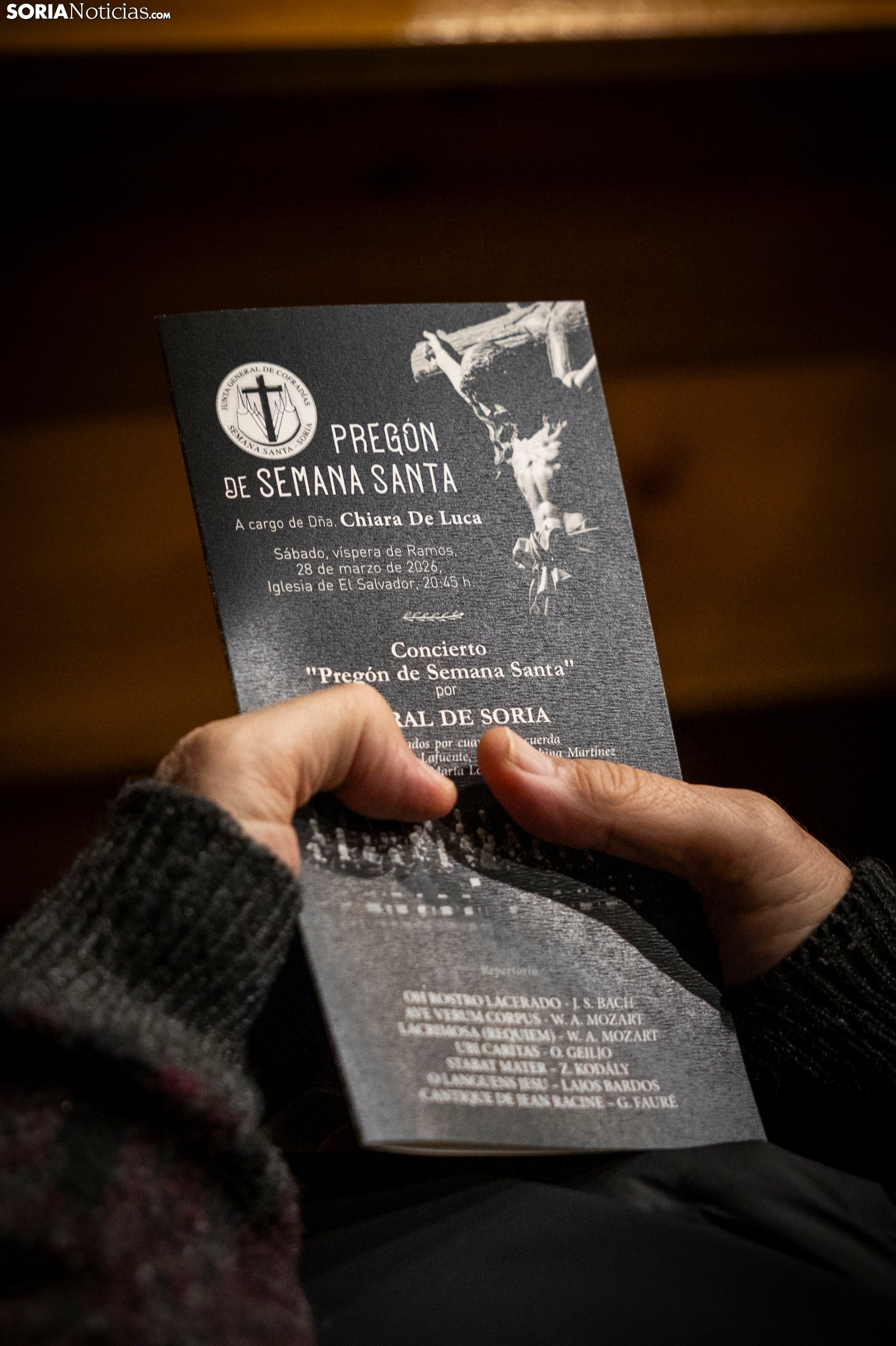 El Pregón de Semana Santa 2026 ha marcado un inicio solemne para las celebraciones en Soria, con un discurso cargado de significado a cargo de Chiara De Luca, hermana de la Cofradía de la Flagelación del Señor. La velada ha alcanzado su punto álgido con el posterior concierto de la Coral de Soria, bajo la dirección de Marta López Condado, ofreciendo una interpretación magistral de grandes obras de la música sacra.