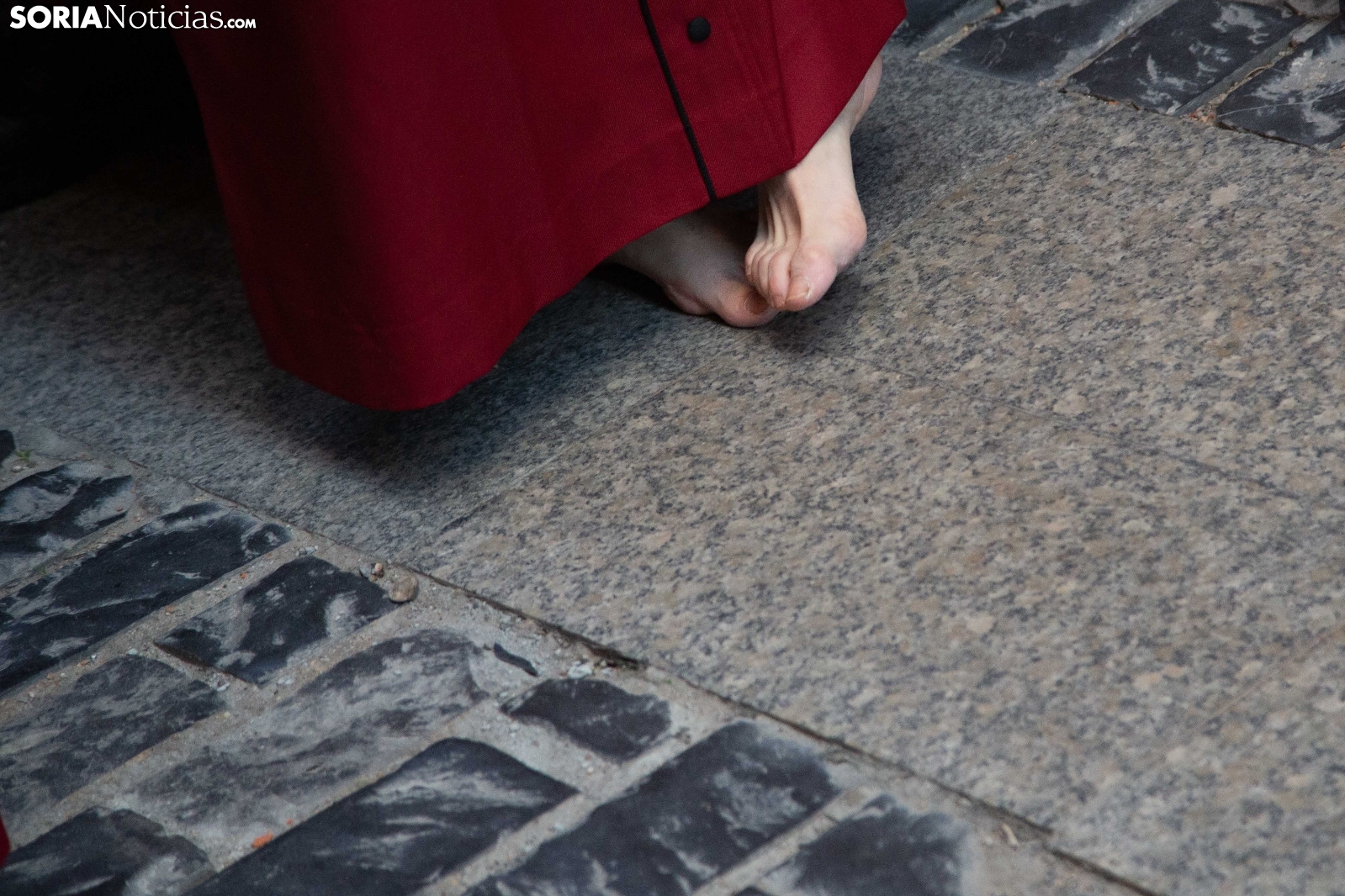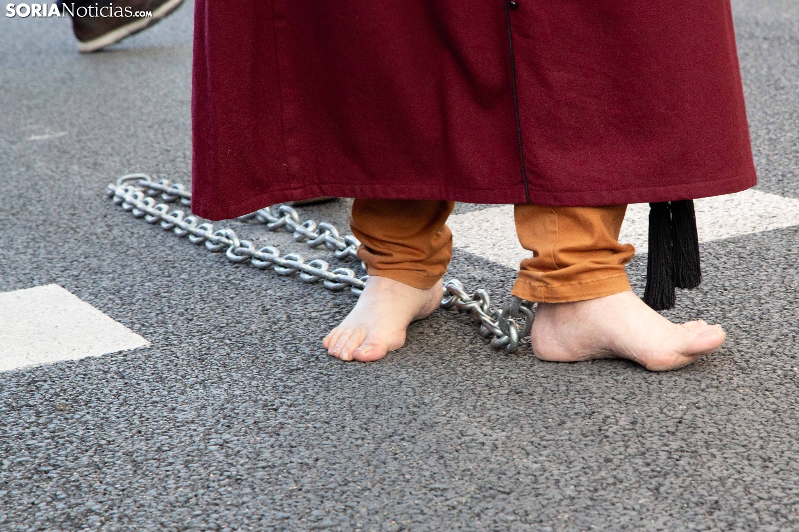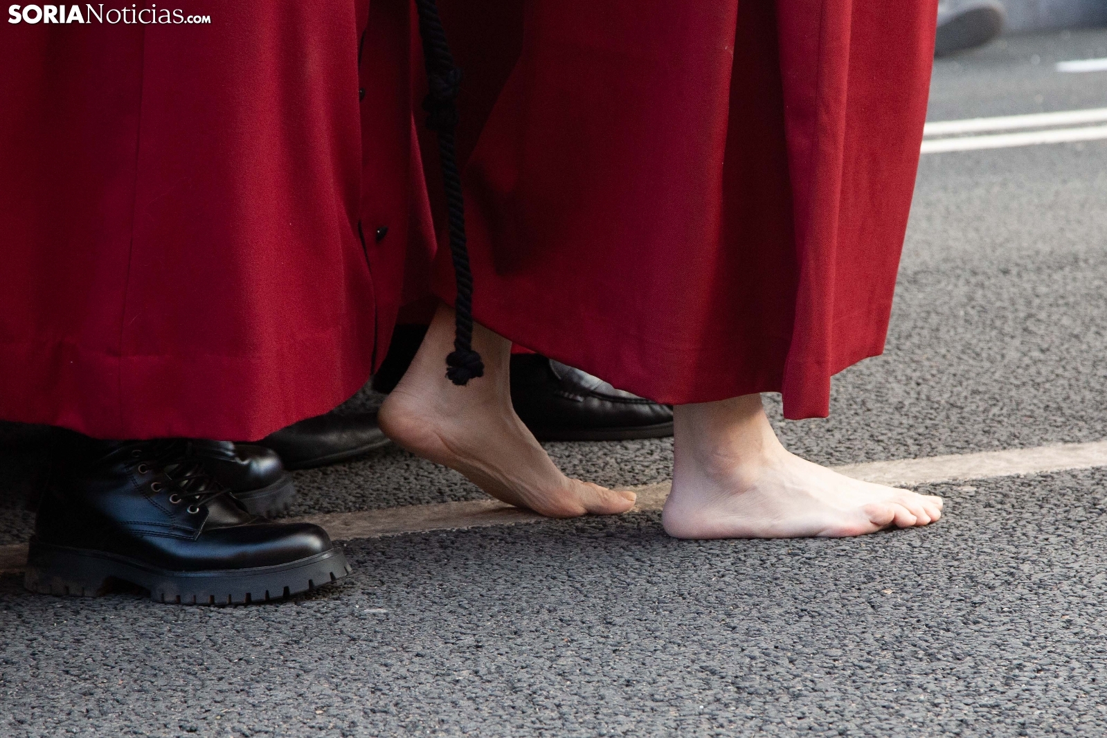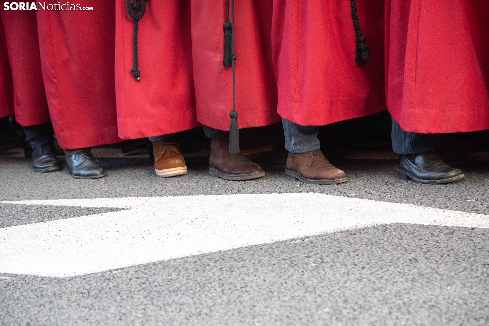 La tarde del Jueves Santo soriano se ha vestido de devoción con la salida a las calles de la Cofradía de las Caídas de Jesús, una de las citas más solemnes de la Semana Santa en la capital. Cientos de vecinos y visitantes se han congregado a lo largo del recorrido para acompañar a los cofrades en su tradicional penitencia, que ha tenido su punto de partida y final en la Concatedral de San Pedro Apóstol. La comitiva ha procesionado por el corazón de la ciudad, atravesando arterias emblemáticas como la calle Real, la Plaza Mayor, El Collado y la plaza Mariano Granados, y ha dejado a su paso estampas de gran recogimiento y tradición.