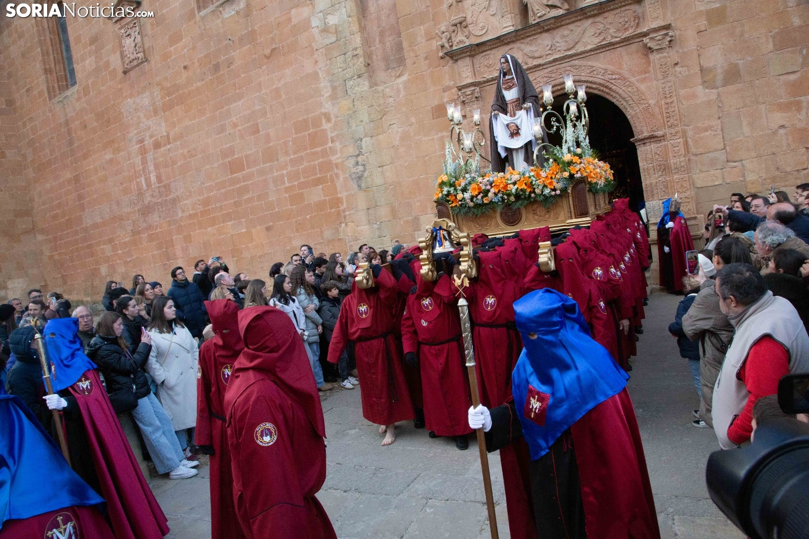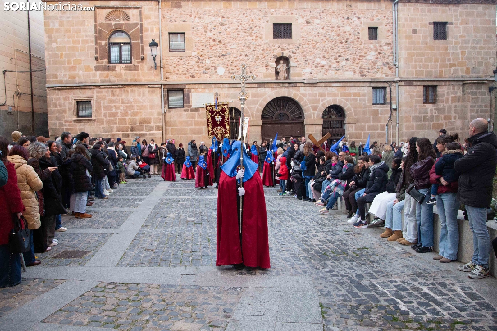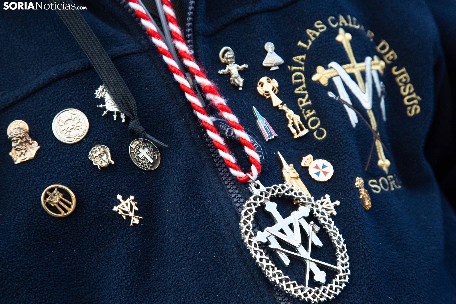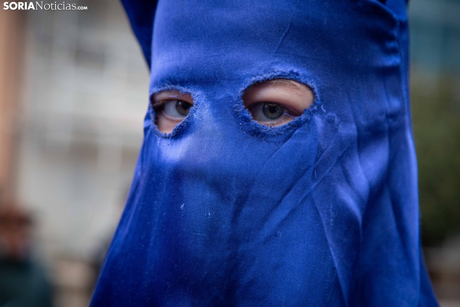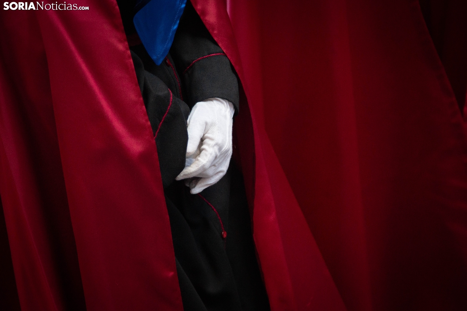 La tarde del Jueves Santo soriano se ha vestido de devoción con la salida a las calles de la Cofradía de las Caídas de Jesús, una de las citas más solemnes de la Semana Santa en la capital. Cientos de vecinos y visitantes se han congregado a lo largo del recorrido para acompañar a los cofrades en su tradicional penitencia, que ha tenido su punto de partida y final en la Concatedral de San Pedro Apóstol. La comitiva ha procesionado por el corazón de la ciudad, atravesando arterias emblemáticas como la calle Real, la Plaza Mayor, El Collado y la plaza Mariano Granados, y ha dejado a su paso estampas de gran recogimiento y tradición.