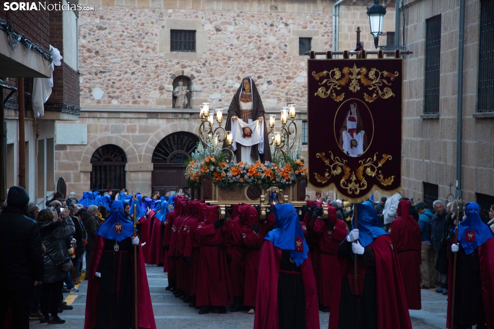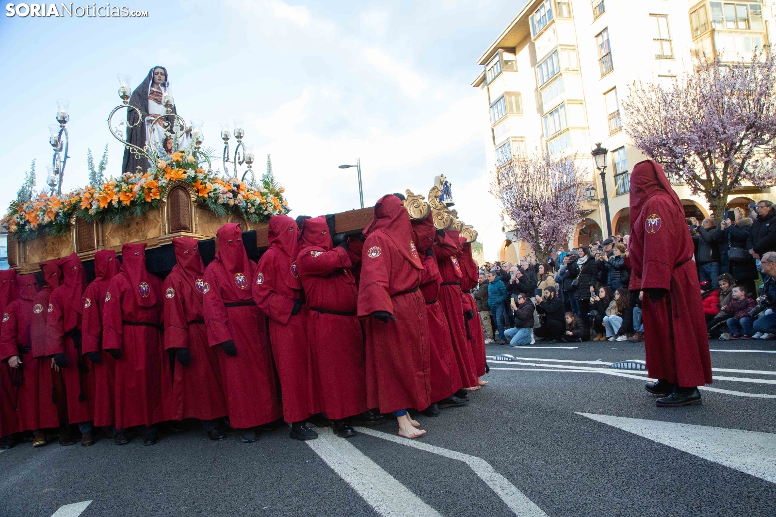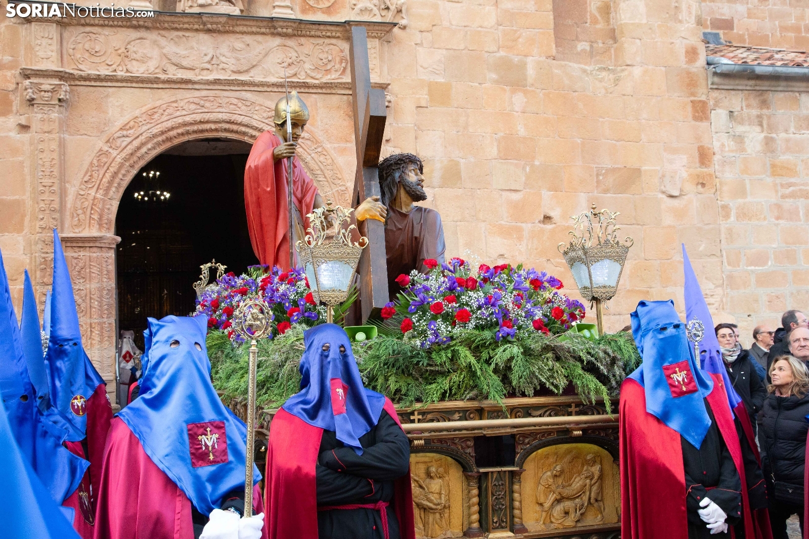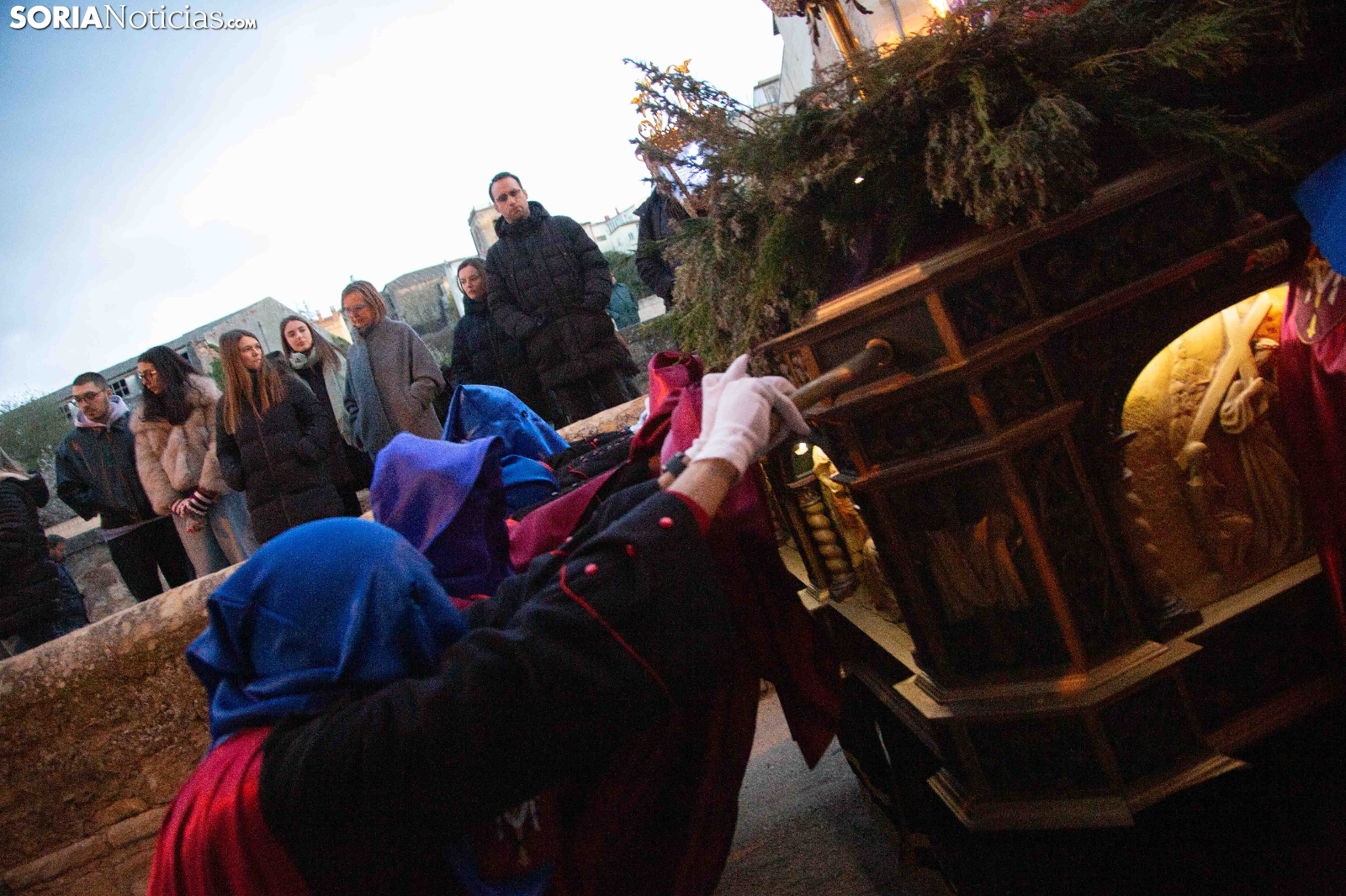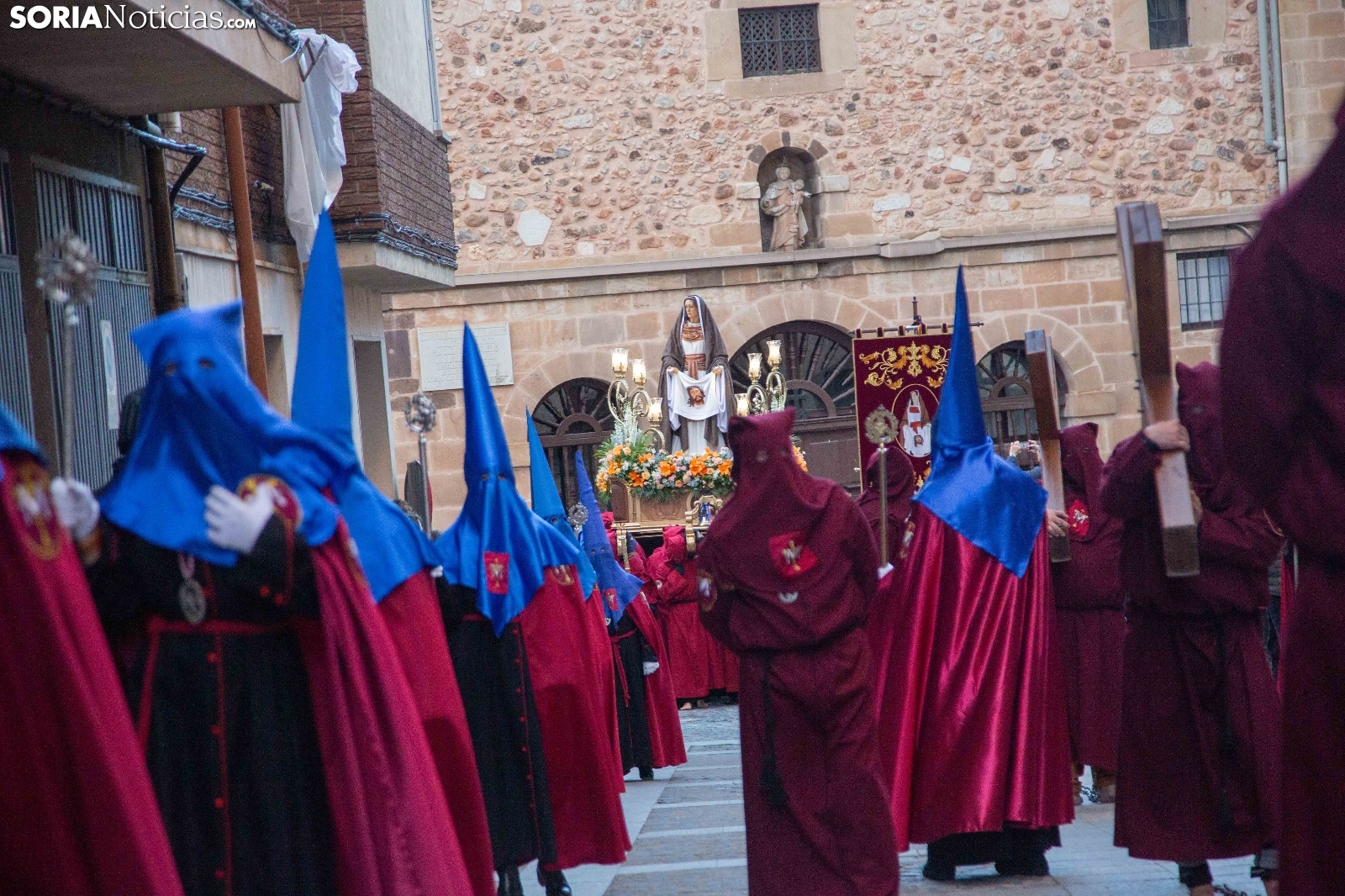 La tarde del Jueves Santo soriano se ha vestido de devoción con la salida a las calles de la Cofradía de las Caídas de Jesús, una de las citas más solemnes de la Semana Santa en la capital. Cientos de vecinos y visitantes se han congregado a lo largo del recorrido para acompañar a los cofrades en su tradicional penitencia, que ha tenido su punto de partida y final en la Concatedral de San Pedro Apóstol. La comitiva ha procesionado por el corazón de la ciudad, atravesando arterias emblemáticas como la calle Real, la Plaza Mayor, El Collado y la plaza Mariano Granados, y ha dejado a su paso estampas de gran recogimiento y tradición.