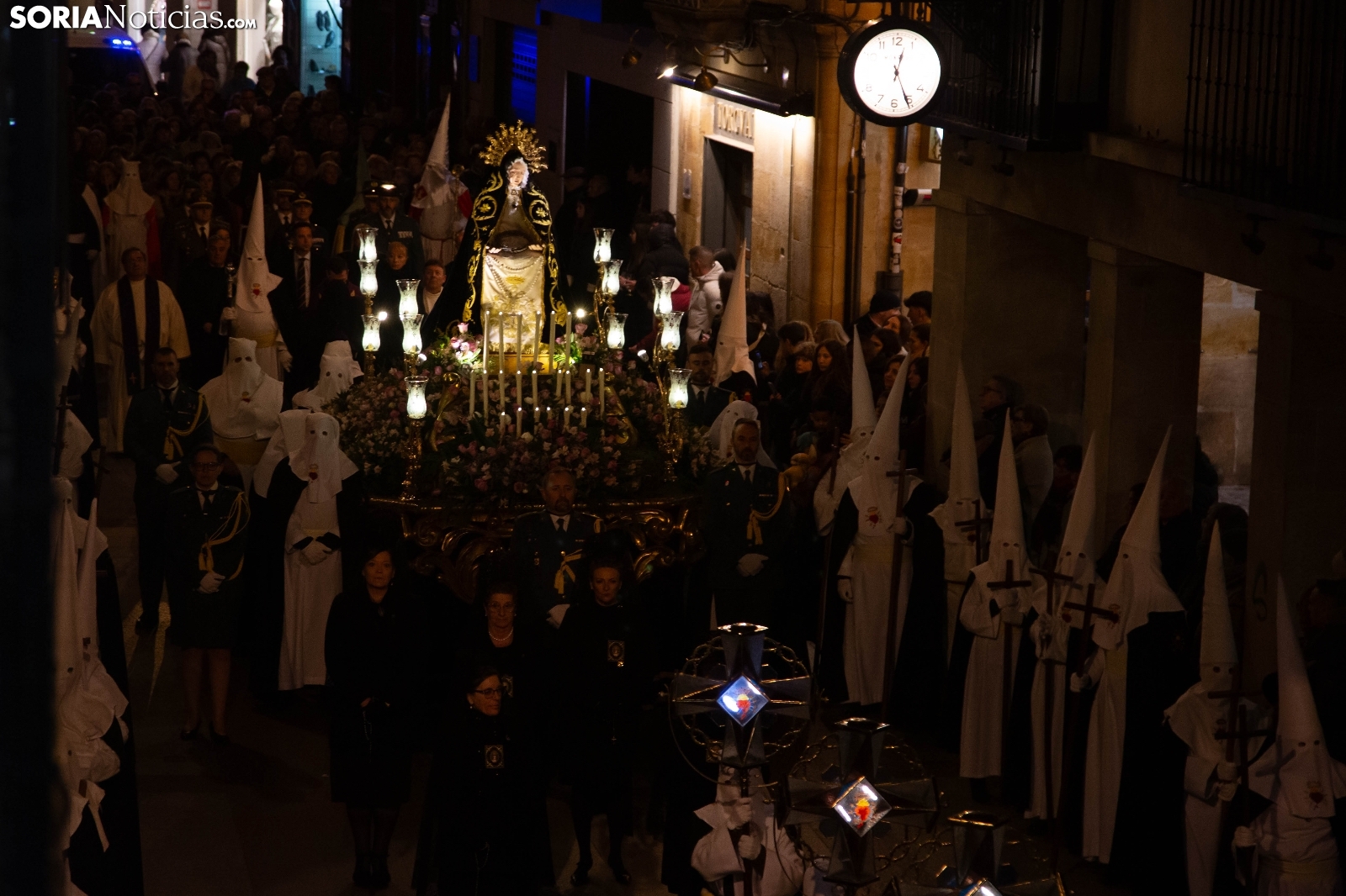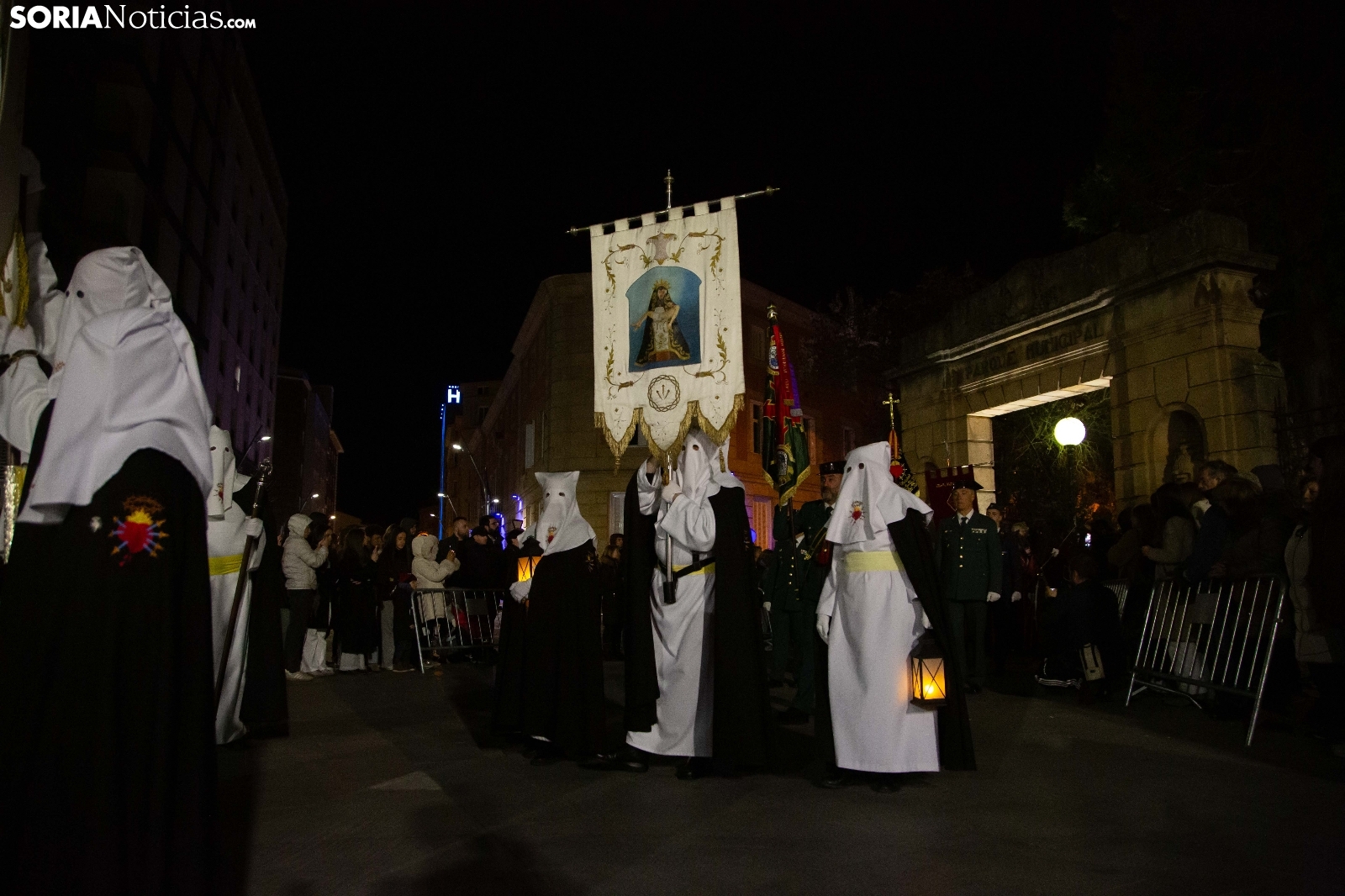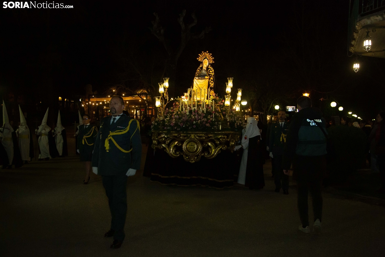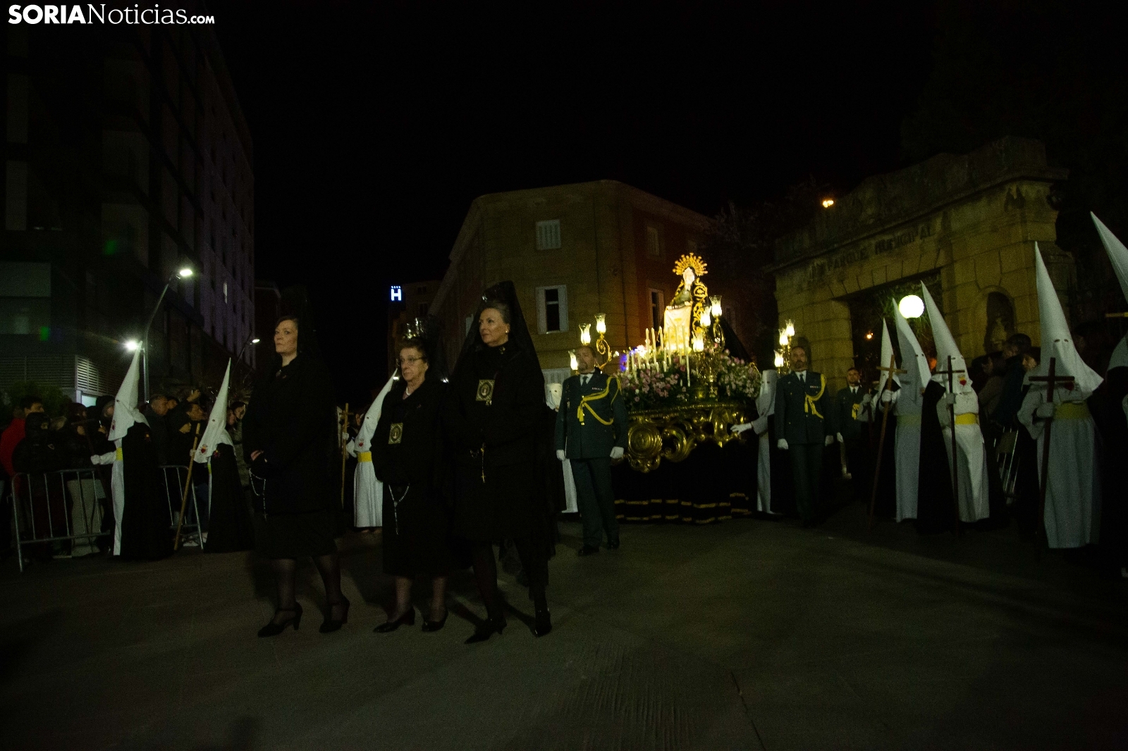 La noche del Jueves Santo en la capital soriana ha estado marcada por el fervor y el silencio al paso de la Cofradía de la Virgen de la Soledad. Los cofrades han iniciado su solemne recorrido desde la Ermita de la Soledad, ubicada en el emblemático parque de la Alameda de Cervantes, para adentrarse en el centro de la ciudad. Acompañada por la devoción de cientos de vecinos, la comitiva ha atravesado vías principales como la plaza Mariano Granados, El Collado y la Plaza Mayor, hasta concluir su trayecto de penitencia en la Concatedral de San Pedro Apóstol.