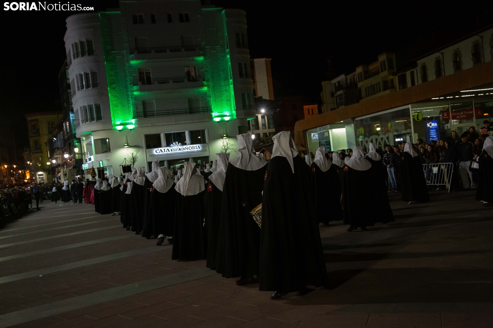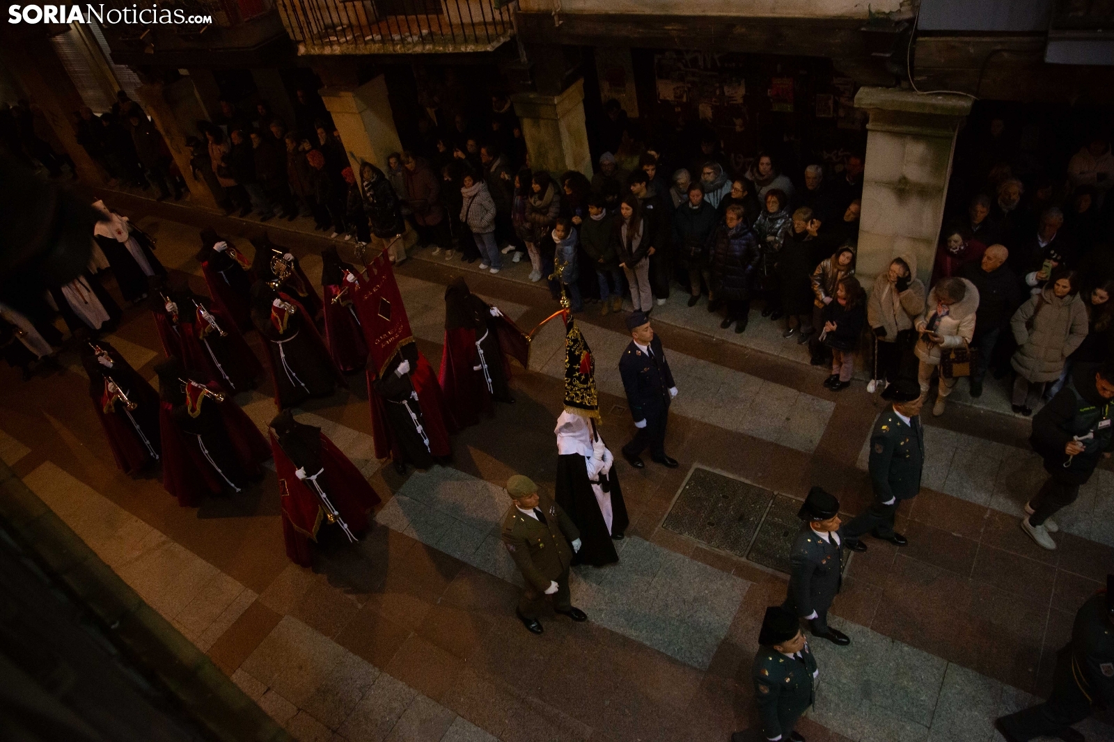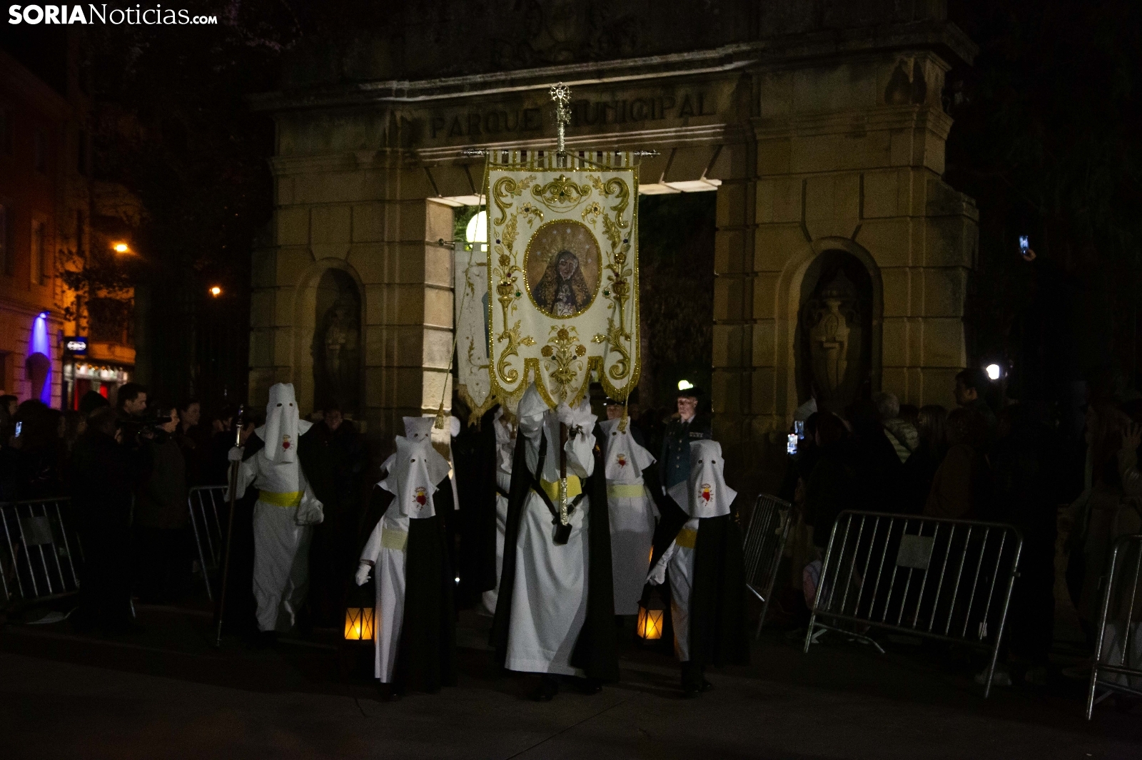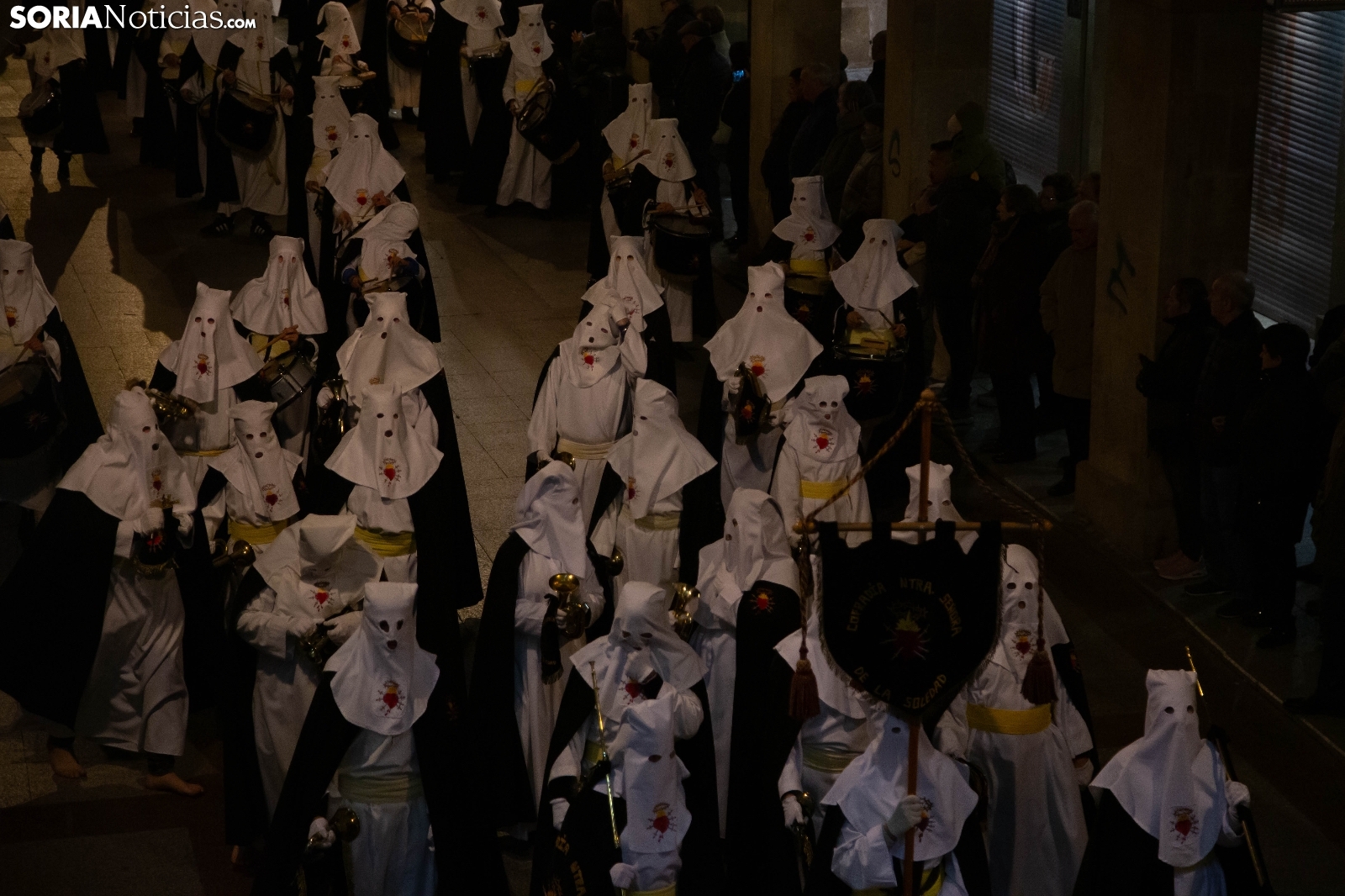 La noche del Jueves Santo en la capital soriana ha estado marcada por el fervor y el silencio al paso de la Cofradía de la Virgen de la Soledad. Los cofrades han iniciado su solemne recorrido desde la Ermita de la Soledad, ubicada en el emblemático parque de la Alameda de Cervantes, para adentrarse en el centro de la ciudad. Acompañada por la devoción de cientos de vecinos, la comitiva ha atravesado vías principales como la plaza Mariano Granados, El Collado y la Plaza Mayor, hasta concluir su trayecto de penitencia en la Concatedral de San Pedro Apóstol.