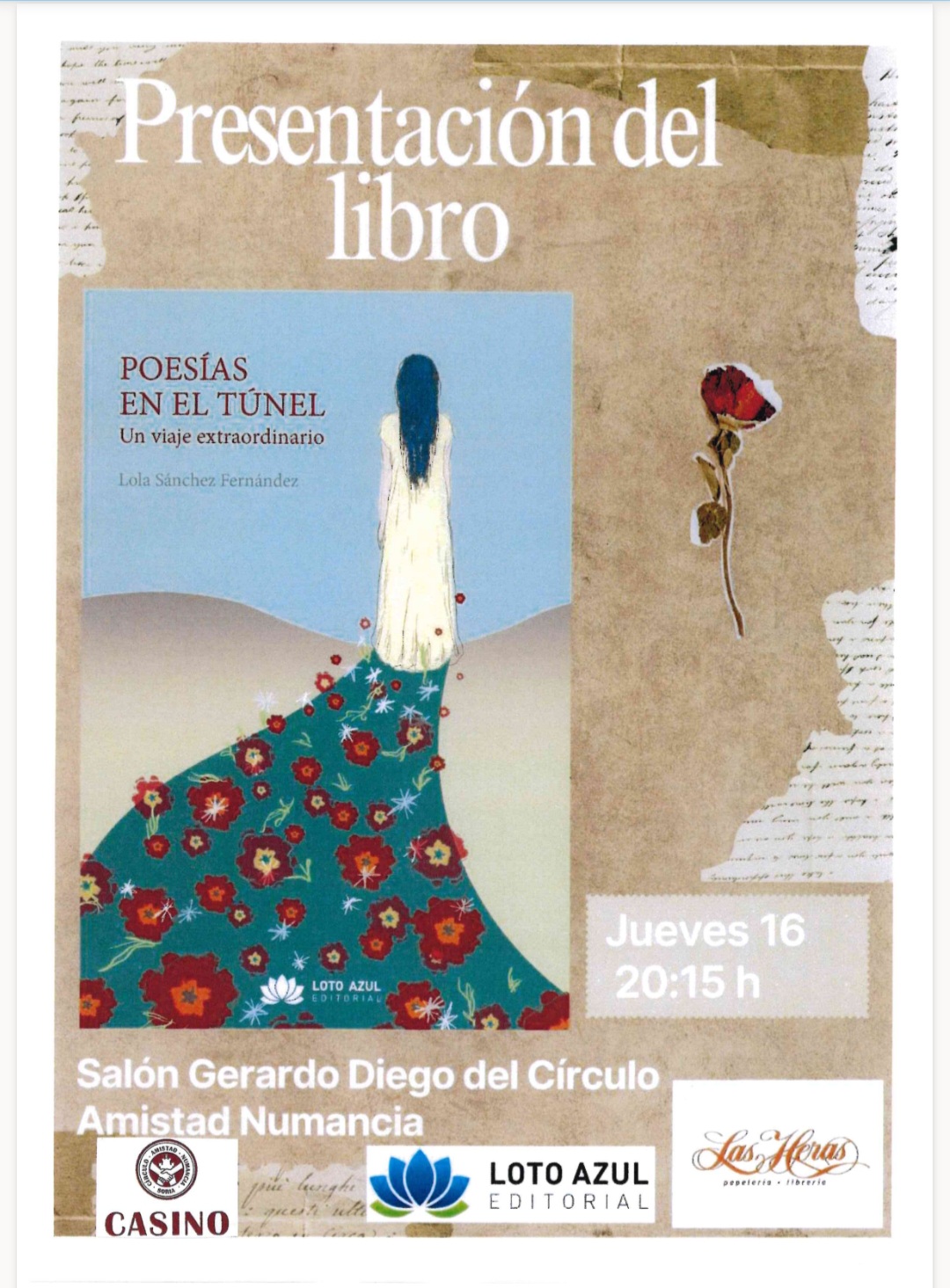 El panorama cultural de la capital soriana suma una nueva cita literaria para esta semana. El salón Gerardo Diego del Círculo Amistad Numancia se prepara albergará este jueves, 16 de abril, la presentación oficial de la obra 'Poesías en el túnel. Un viaje extraordinario', escrita por Lola Sánchez Fernández.
