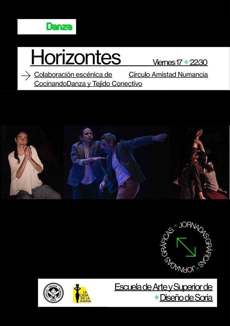 Posteriormente, a las 22.30 horas, la actividad se trasladará al salón principal ubicado en la planta baja del edificio. En este espacio se desarrollará el espectáculo escénico 'Horizontes', una creación conjunta de las compañías CocinandoDanza y Tejido Conectivo. Esta representación, coordinada por La Casa de la Juana, supone la clausura oficial de las 26 jornadas de la Escuela de Arte y Superior de Diseño.