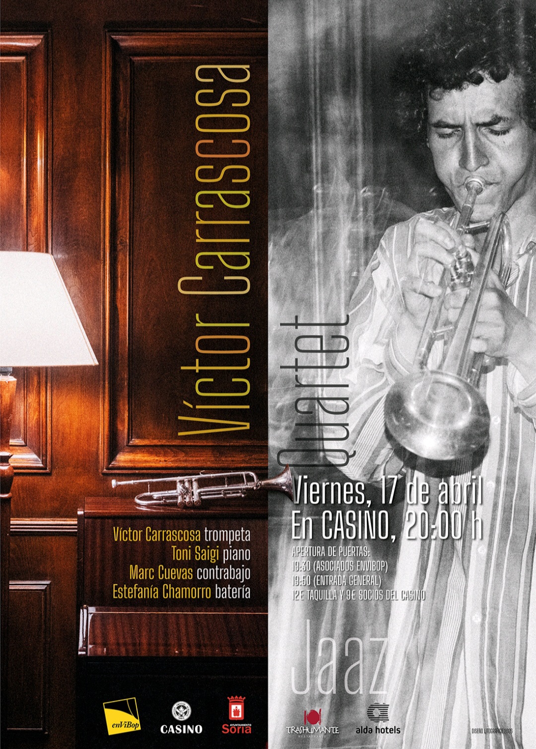 La oferta de ocio arranca a las 20.00 horas en el salón Gerardo Diego con la actuación musical del Víctor Carrasco Quartet. Esta primera propuesta, impulsada por la Asociación Envibop, acercará los sonidos improvisados a los asistentes. El acceso para disfrutar de esta formación tiene un coste de 12 euros para el público general, mientras que los socios del Casino, previa presentación de su carné, cuentan con una tarifa reducida de nueve euros.
