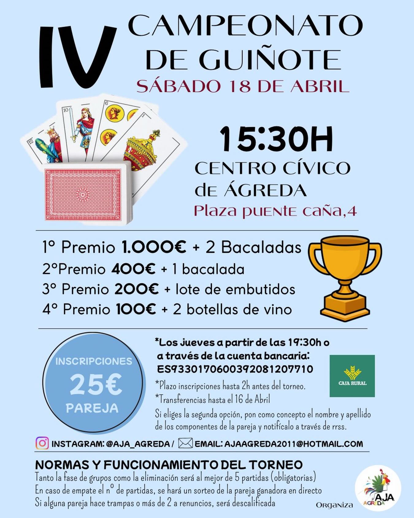 Decir que la competición cuenta con un atractivo cartel de galardones para los vencedores. La pareja que logre alzarse con el primer puesto se embolsará una cuantía de 1.000 euros acompañados de dos bacaladas, mientras que los subcampeones recibirán 400 euros y una pieza. Igualmente, el tercer y cuarto puesto estarán recompensados con 200 euros más un lote de embutidos y 100 euros junto a dos botellas de vino, respectivamente. La cuota de inscripción para tomar parte en esta cita asciende a 25 euros por pareja.