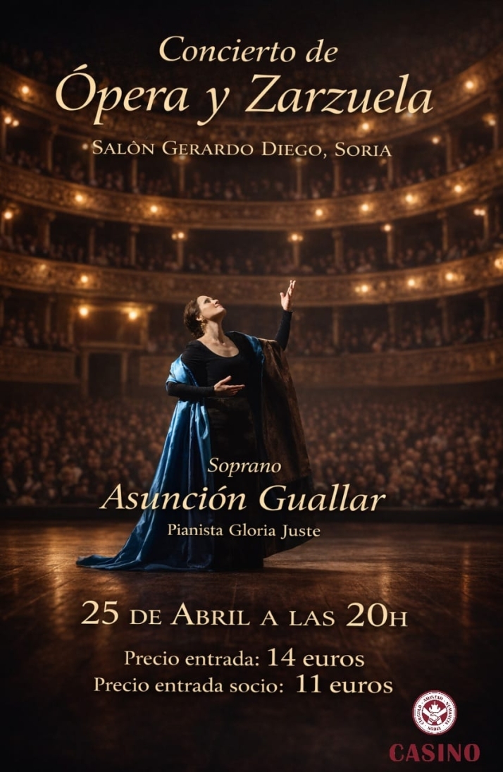 El salón Gerardo Diego del Círculo Amistad Numancia acoge este sábado 25 un concierto de ópera y zarzuela. La cita musical arranca a las 20.00 horas con aforo limitado y entradas a precios reducidos para los socios de la entidad.