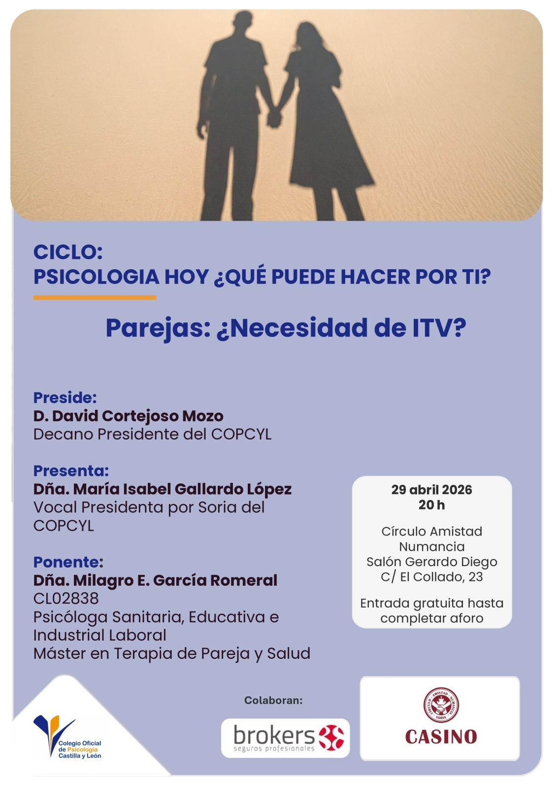 El Colegio de Psicología de Castilla y León (COPCYL) celebra este miércoles, 29 de abril, en Soria la charla 'Parejas: ¿Necesidad de ITV?'. Una cita enmarcada dentro del ciclo 'Psicología Hoy: ¿qué puede hacer por ti?' que busca acercar el análisis psicológico a la sociedad.
